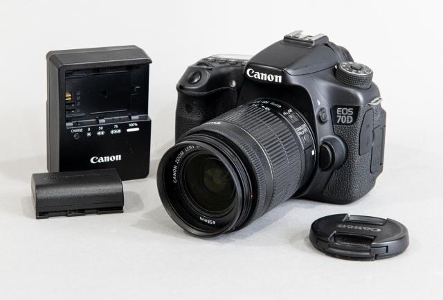 This Canon EOS 70D is a 20.2 MP APS-C DSLR, released in 2013, featuring Dual Pixel CMOS AF for fast live-view focusing, a 3-inch articulating touchscreen, and 7 fps continuous shooting. It is a versatile, mid-range camera suited for both enthusiasts and beginners, offering Full HD 1080p video, Wi-Fi connectivity, and 19-point all cross-type AF. Includes an 18-50mm lens with image stabilization. Complete with battery and battery charger.